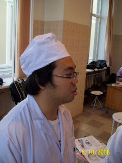 Soon, it started.. Lydia called us one by one. Kent went first, and he managed to answer nicely to her questions. Lydia looks satisfied with him. She gave him a 4. The next person is Gan. Gan was very nervous since the beginning. You can see as he was holding the scapula and sternum in front of Lydia, his hand was shaking like crazy! And probably because of his nervousness, and partly Lydia's own mistakes, he managed to get a 3 only. We were shocked when we knew he got only 3, because he should be the anatomy genius among us, and this genius gets only 3 marks?!